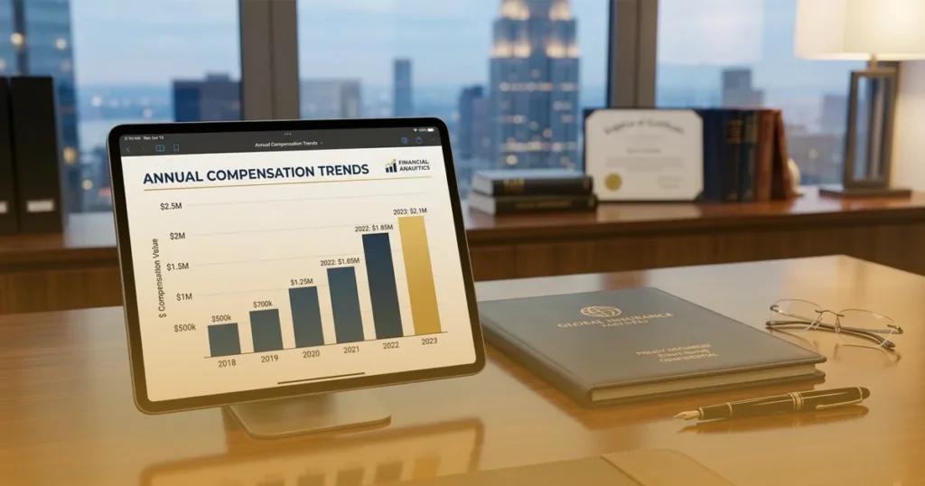 A tablet showing a rising growth chart of compensation values next to an official insurance policy folder and a high-end pen.